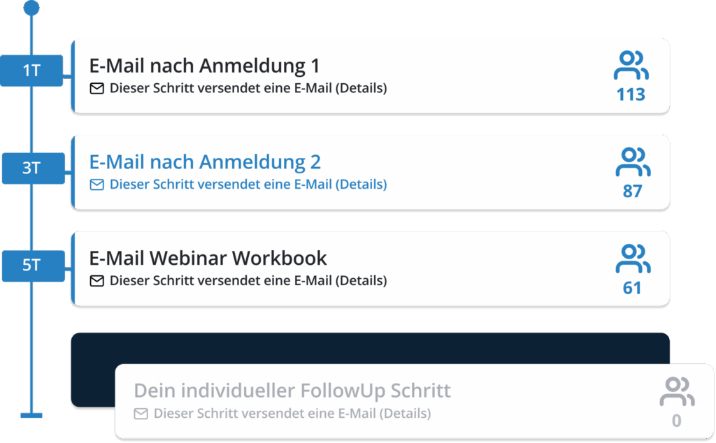 Mit 4leads kannst du unkompliziert komplette Kampagnen-Strukturen rund um den Webinar-Termin aufbauen. So hast du die Möglichkeit, dein E-Mail-Marketing im Nachgang des Webinars vollständig automatisiert zu gestalten.